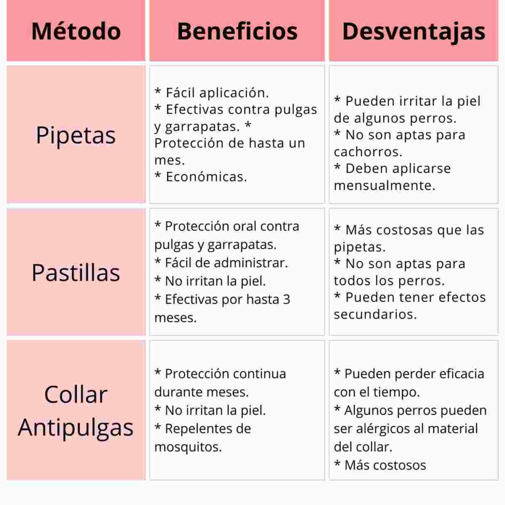 Ya vimos las posibles consecuencias de no tratar correctamente a estos enemigos de nuestrso peluditos. A continuación, queremos entregarte una tabla comparativa de los principales metodos antipulgas, con sus beneficios y desventajas para que sea más facíl tu evaluación: